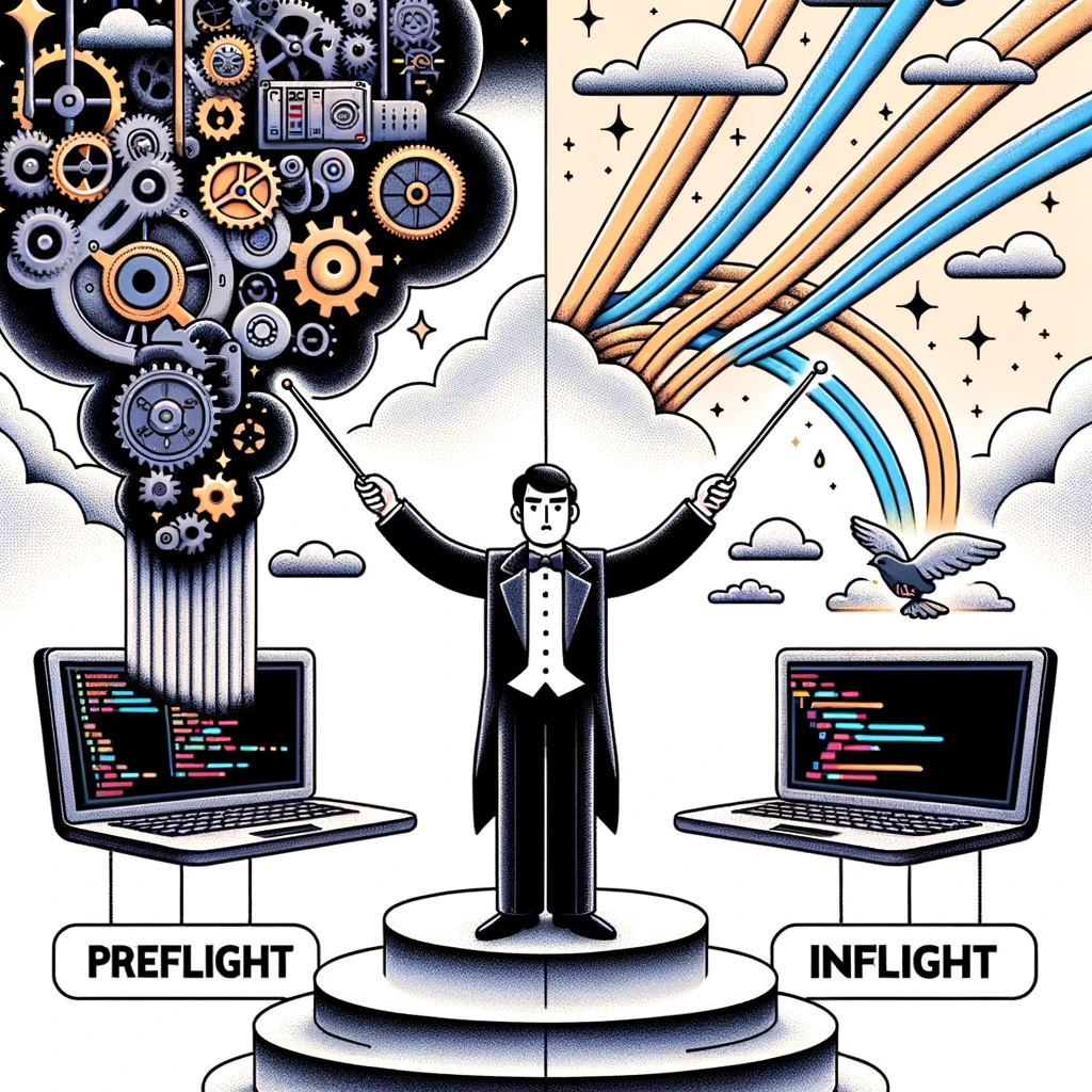 - Preflight: Code that runs once, at compile time, and generates the infrastructure configuration of your cloud application. For example, setting up databases, queues, storage buckets, API endpoints, etc.